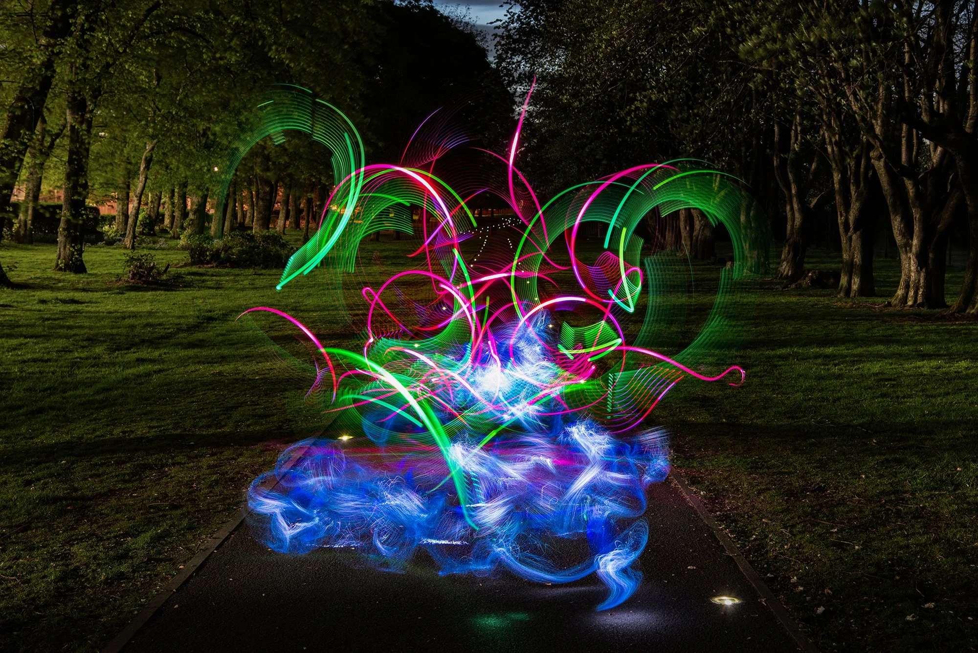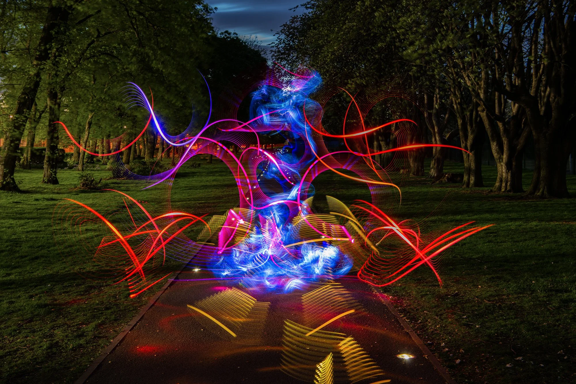 Light painting with colorful neon lights on a park path at night, surrounded by trees.