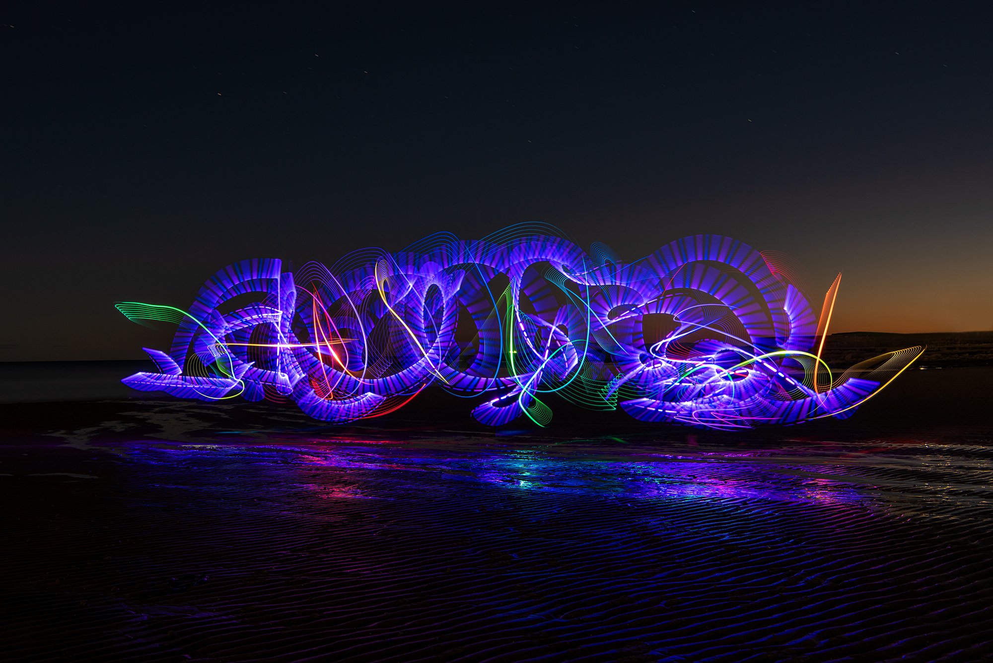 Colorful light trails on a dark beach at night, creating abstract patterns with a variety of colors including blue, purple, green, yellow, and red.