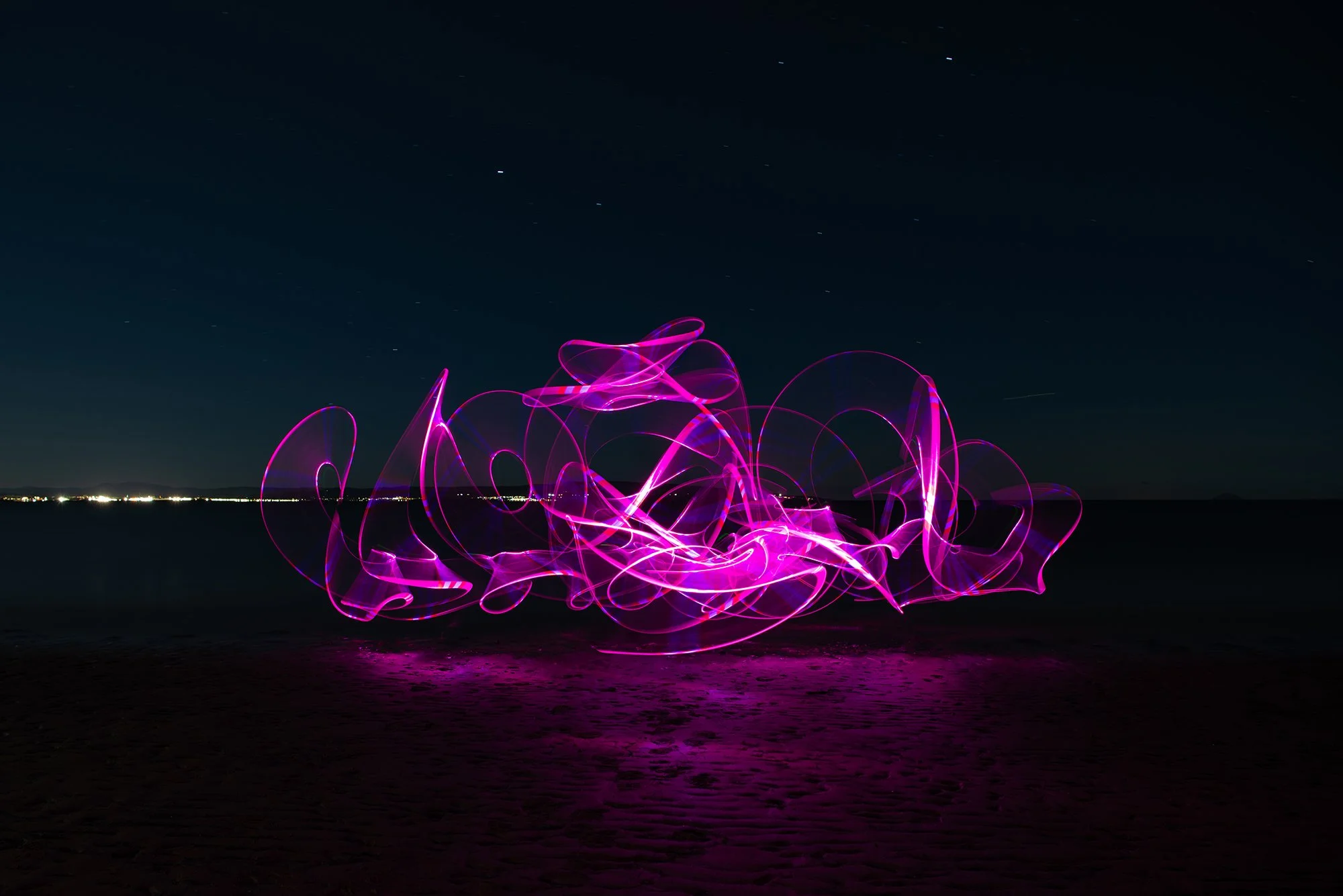 Long exposure photograph of pink and purple light trails over a dark beach at night.
