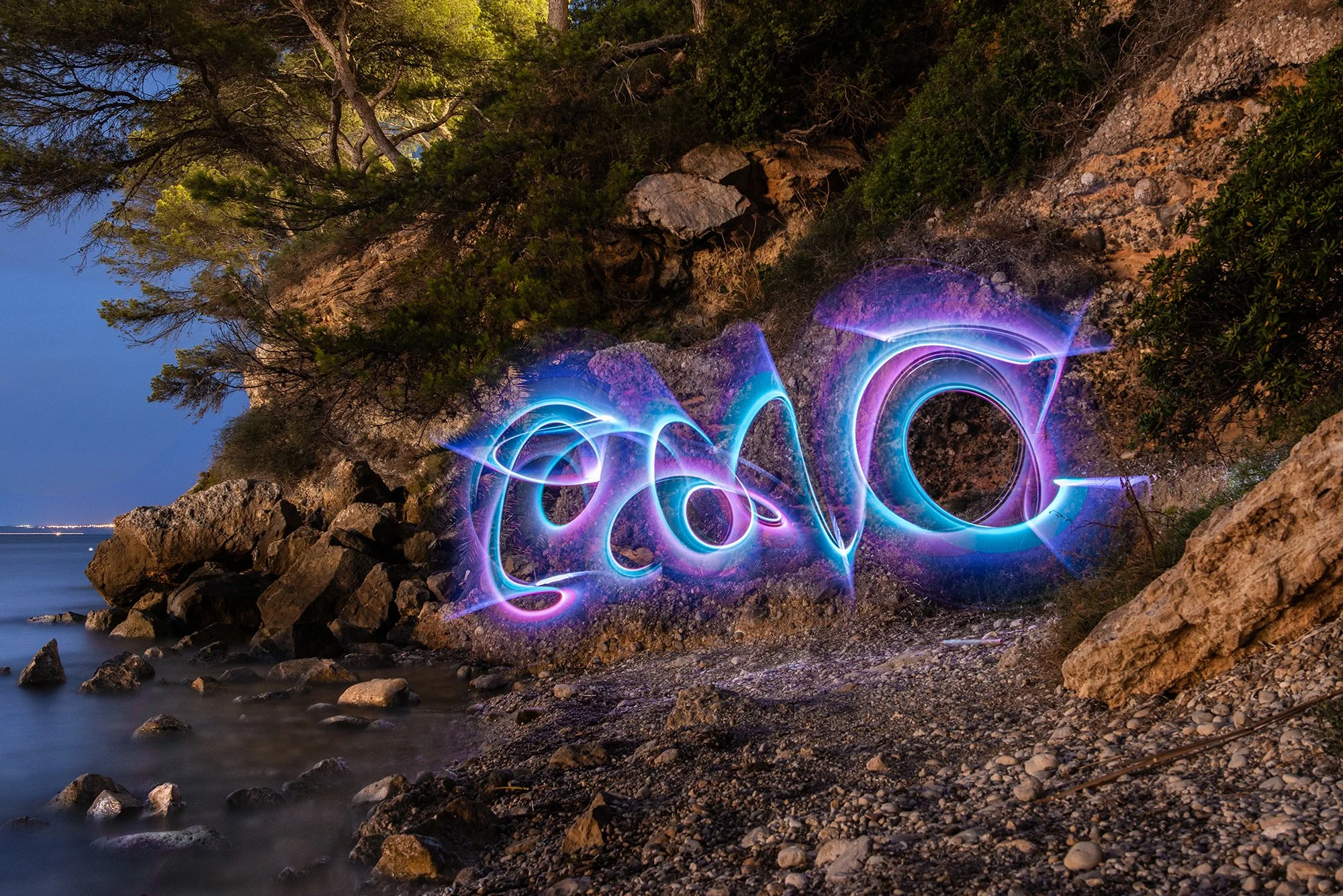 Light painting in a rocky outdoor setting with stones and green bushes, creating vibrant blue and purple swirling light trails.
