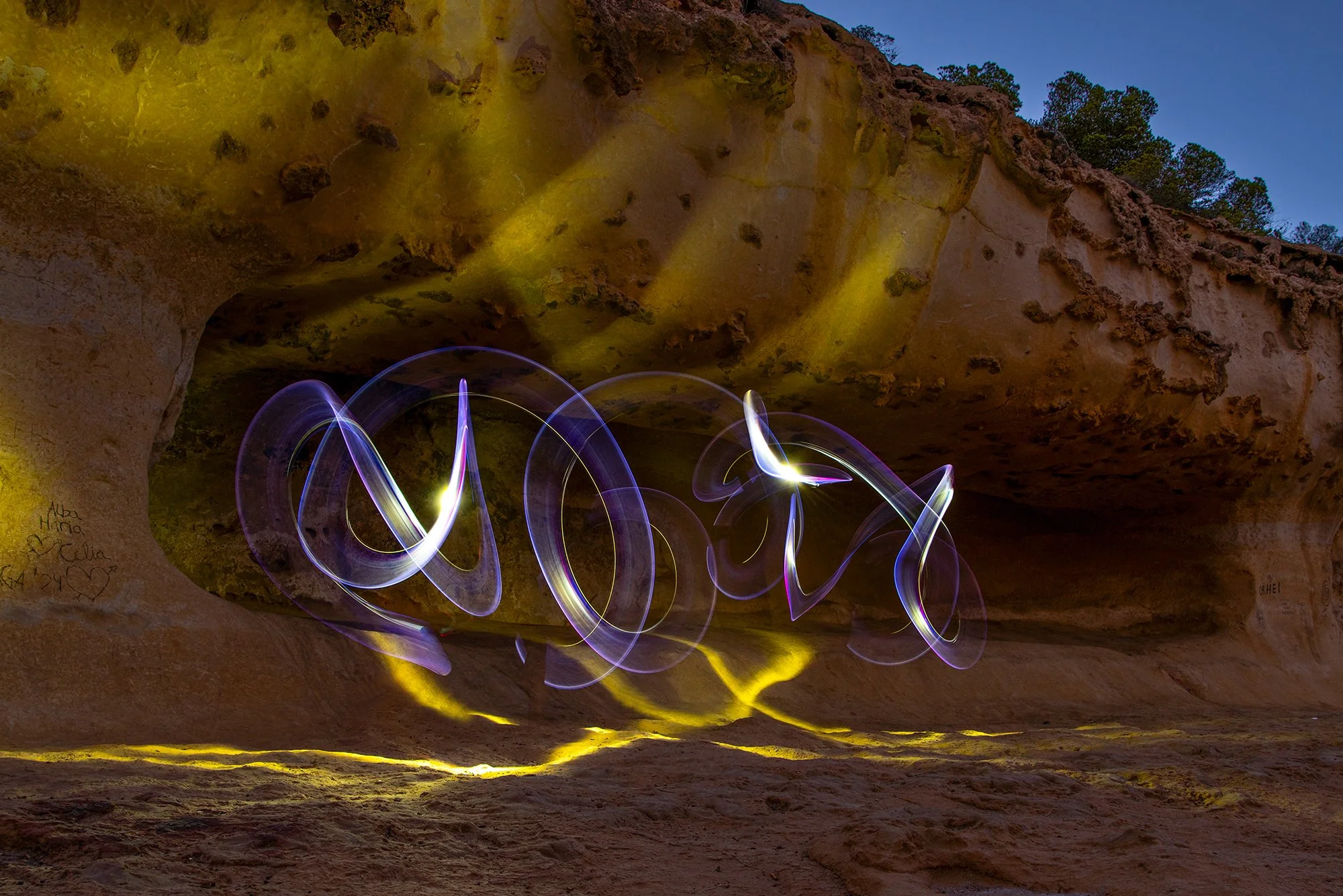 Light painting with purple and yellow streaks inside a rocky cave with graffiti and partially visible blue sky outside.