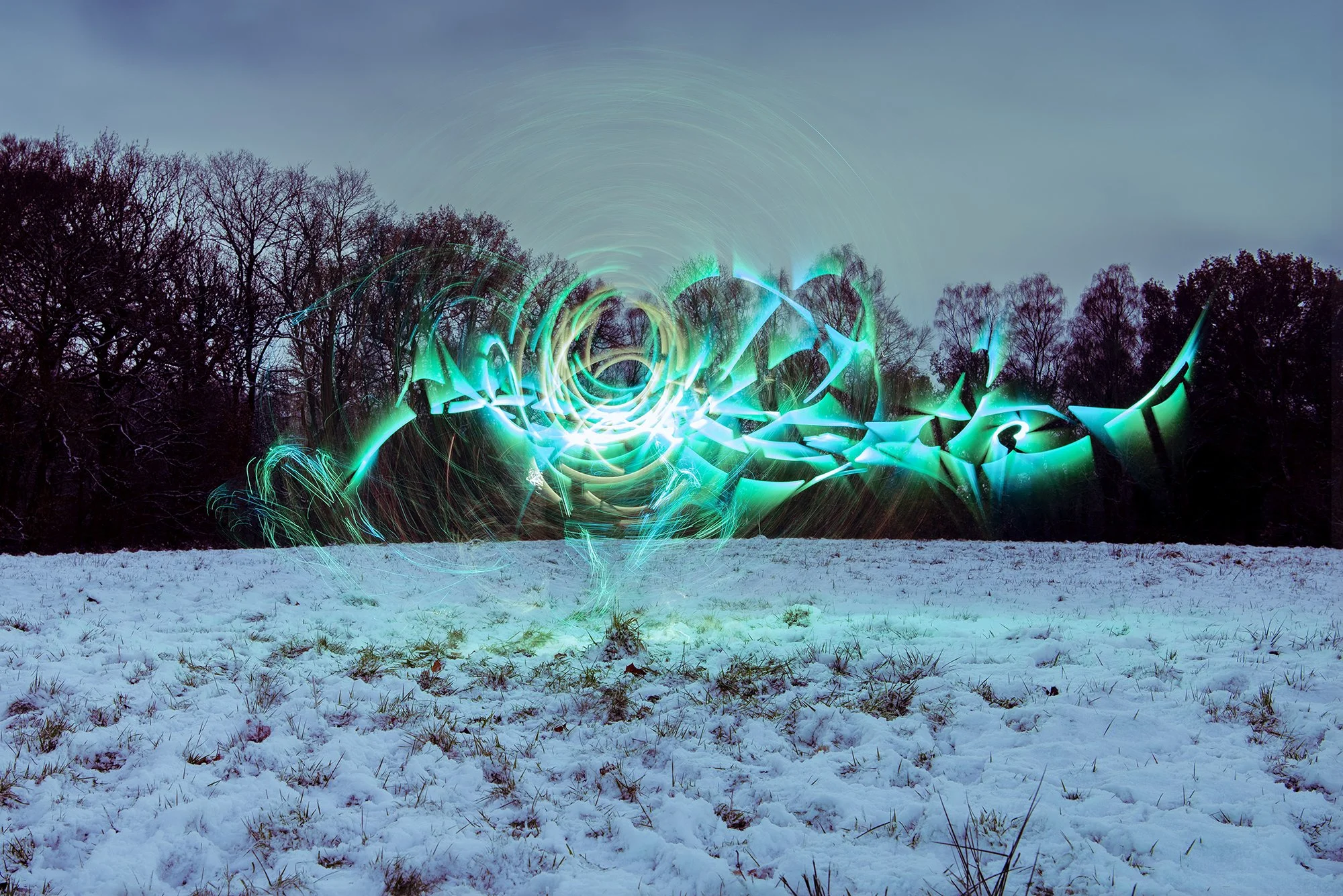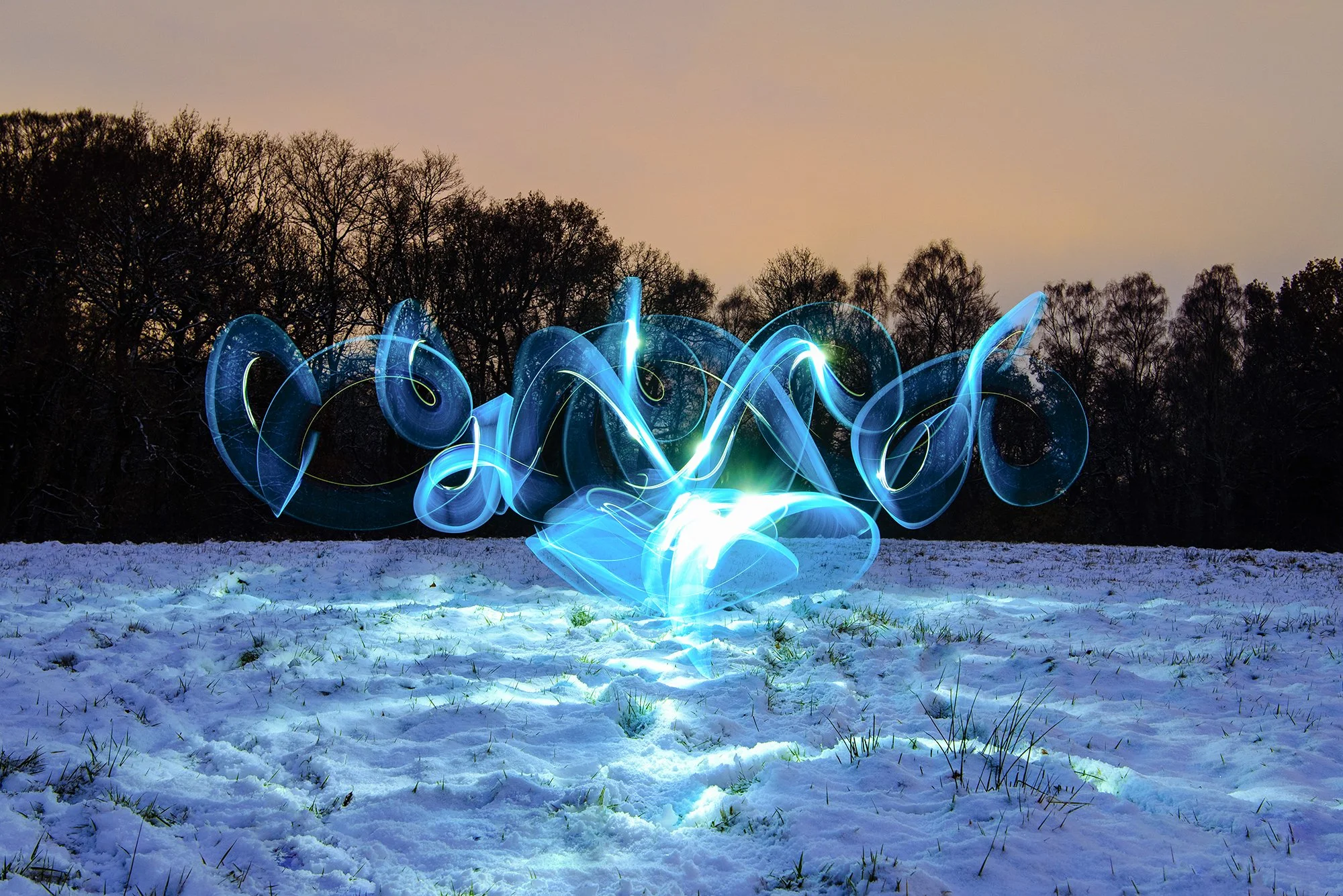 Light trails glowing blue in a snowy field at dusk, with a dark treeline and a cloudy sky in the background.