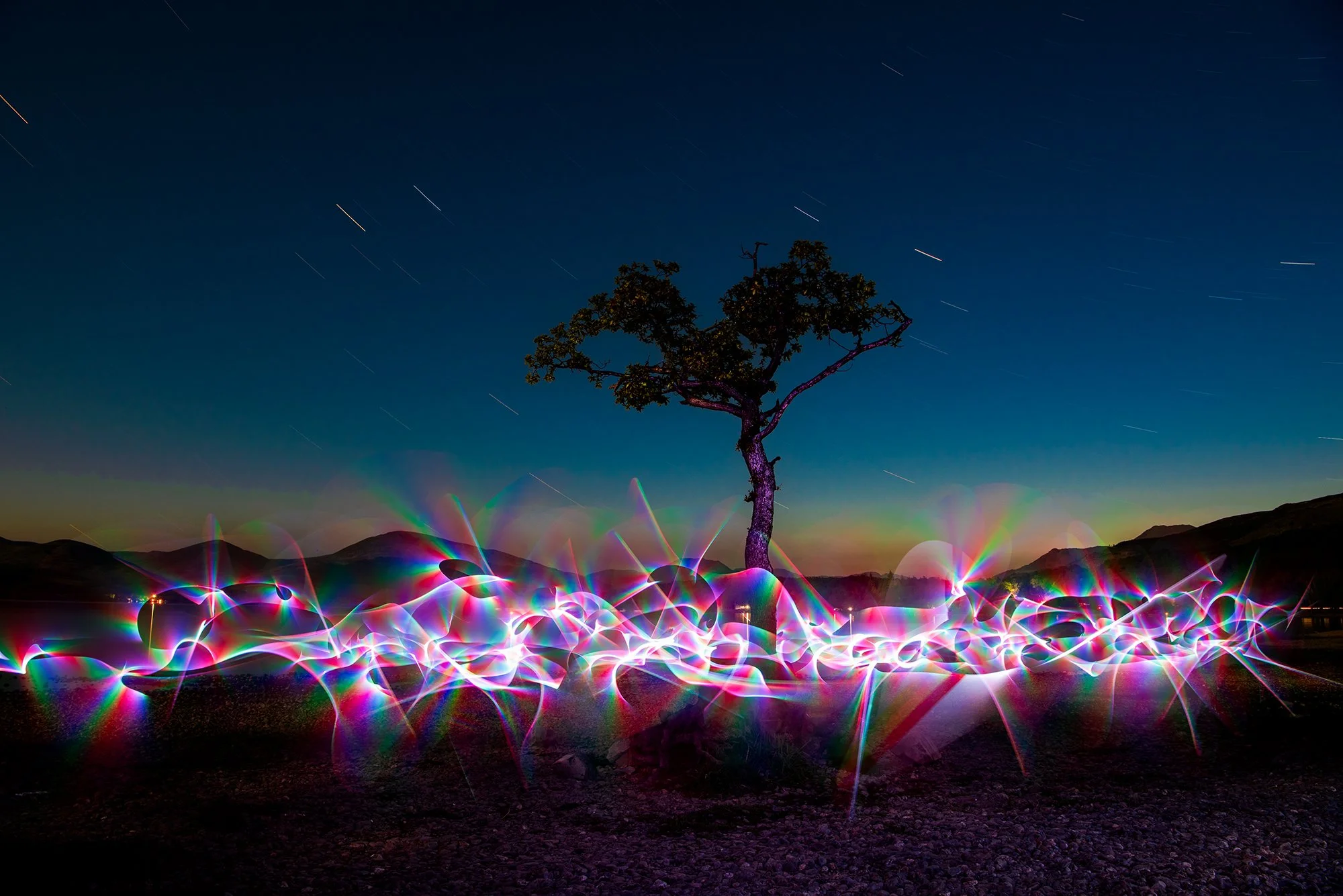 A solitary tree stands in a landscape at dusk, with star trails and colorful light streaks at its base creating a surreal scene.