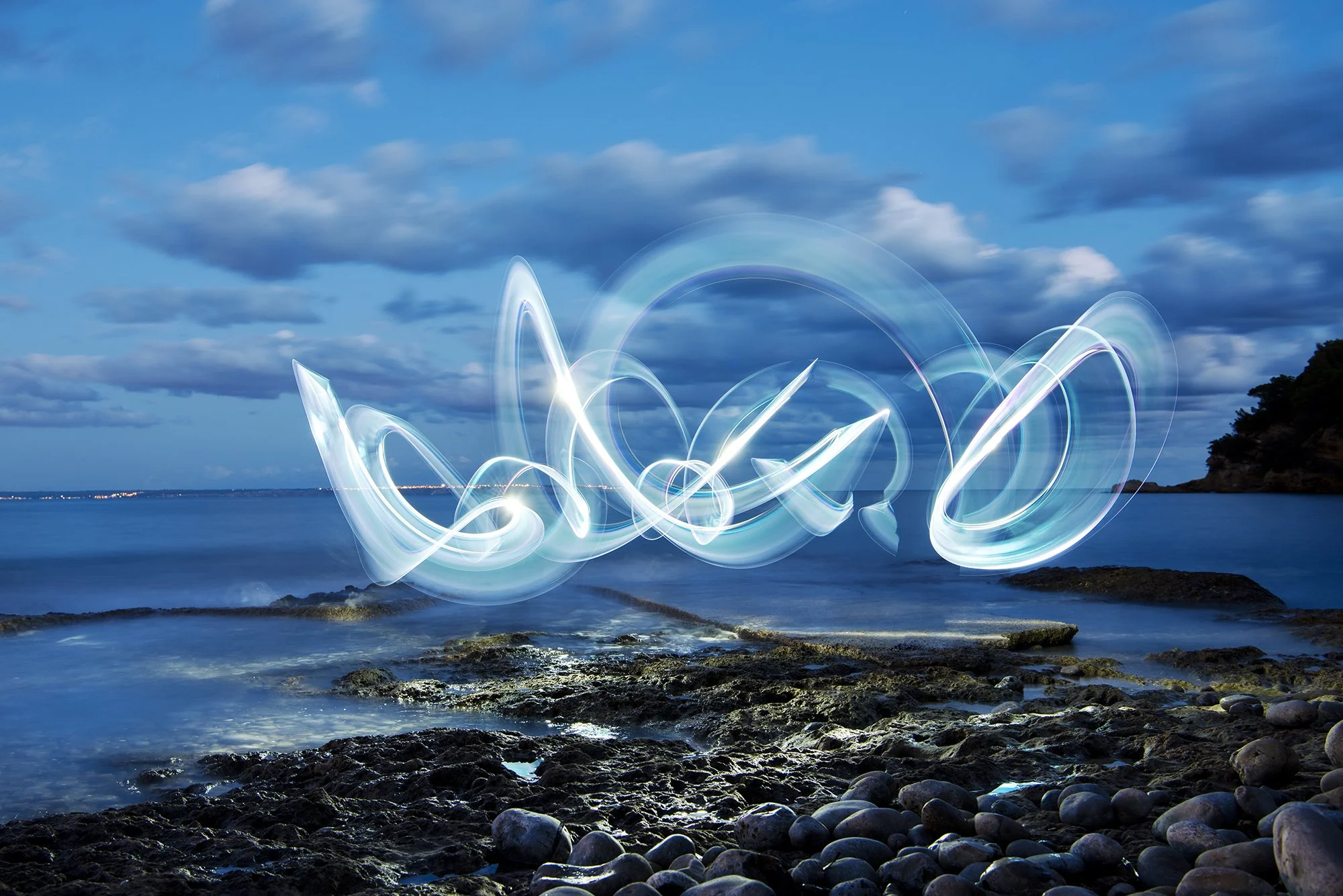 Long exposure photograph of a rocky shoreline at dusk with light painting using a light source creating swirling white light patterns in the air over the water and dark clouds in the sky.