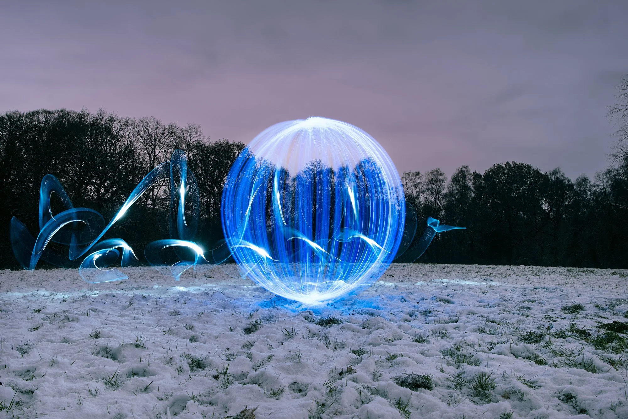 Long exposure photograph of a glowing blue light orb and streaks of light in a snowy field with trees in the background during sunset.