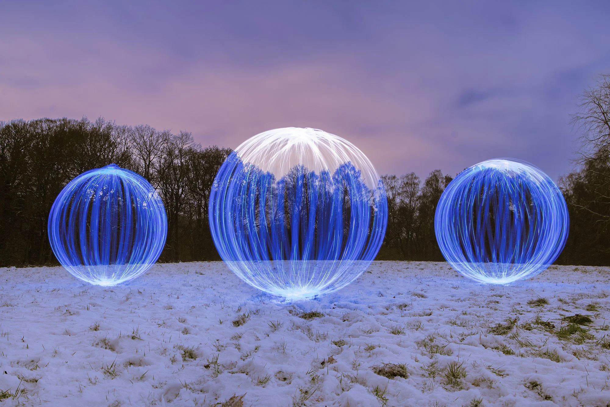 Light trails create three glowing spheres on snow-covered ground with a forest and purple sky in the background.