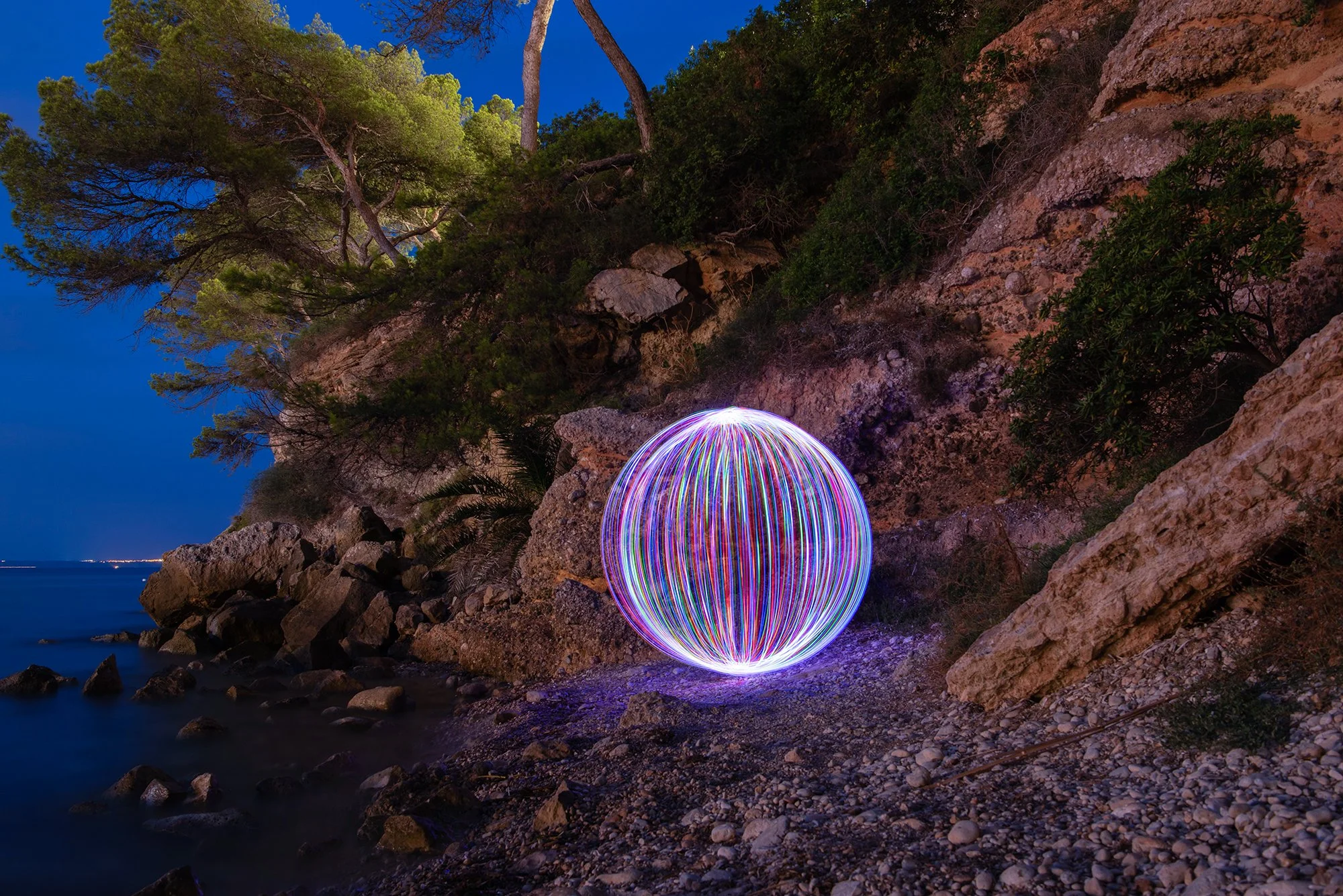 Light painting of a glowing multicolored sphere on a rocky shoreline at night.