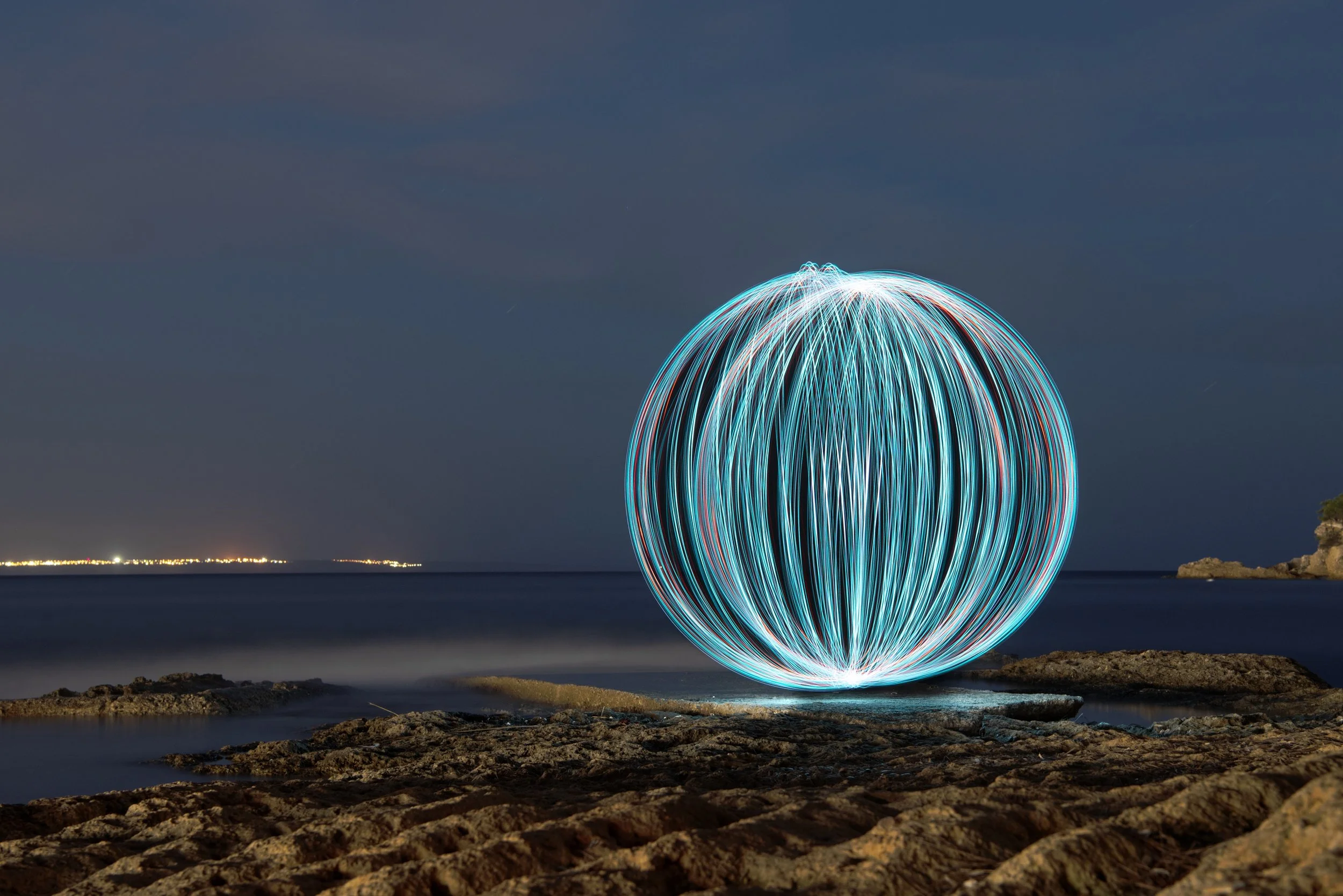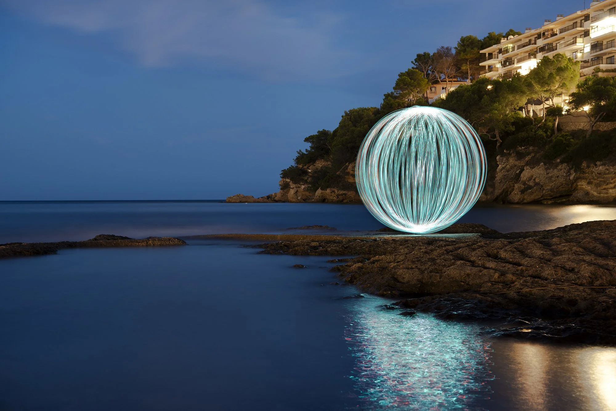 Long exposure photo of a spherical light display on a rocky shore at night, with the ocean and distant lights in the background.
