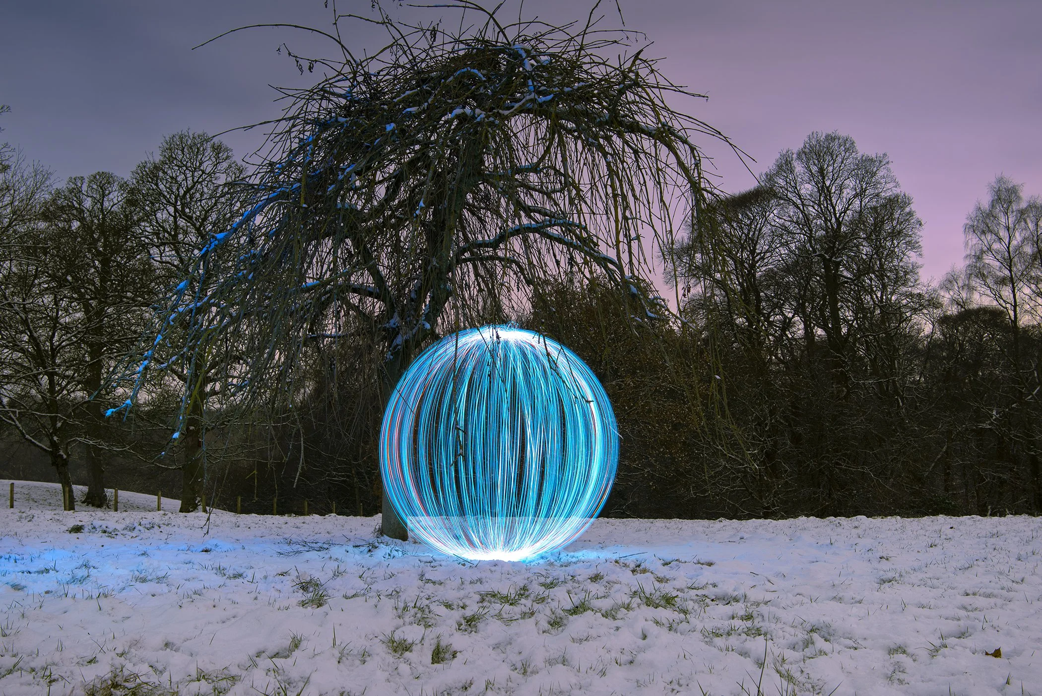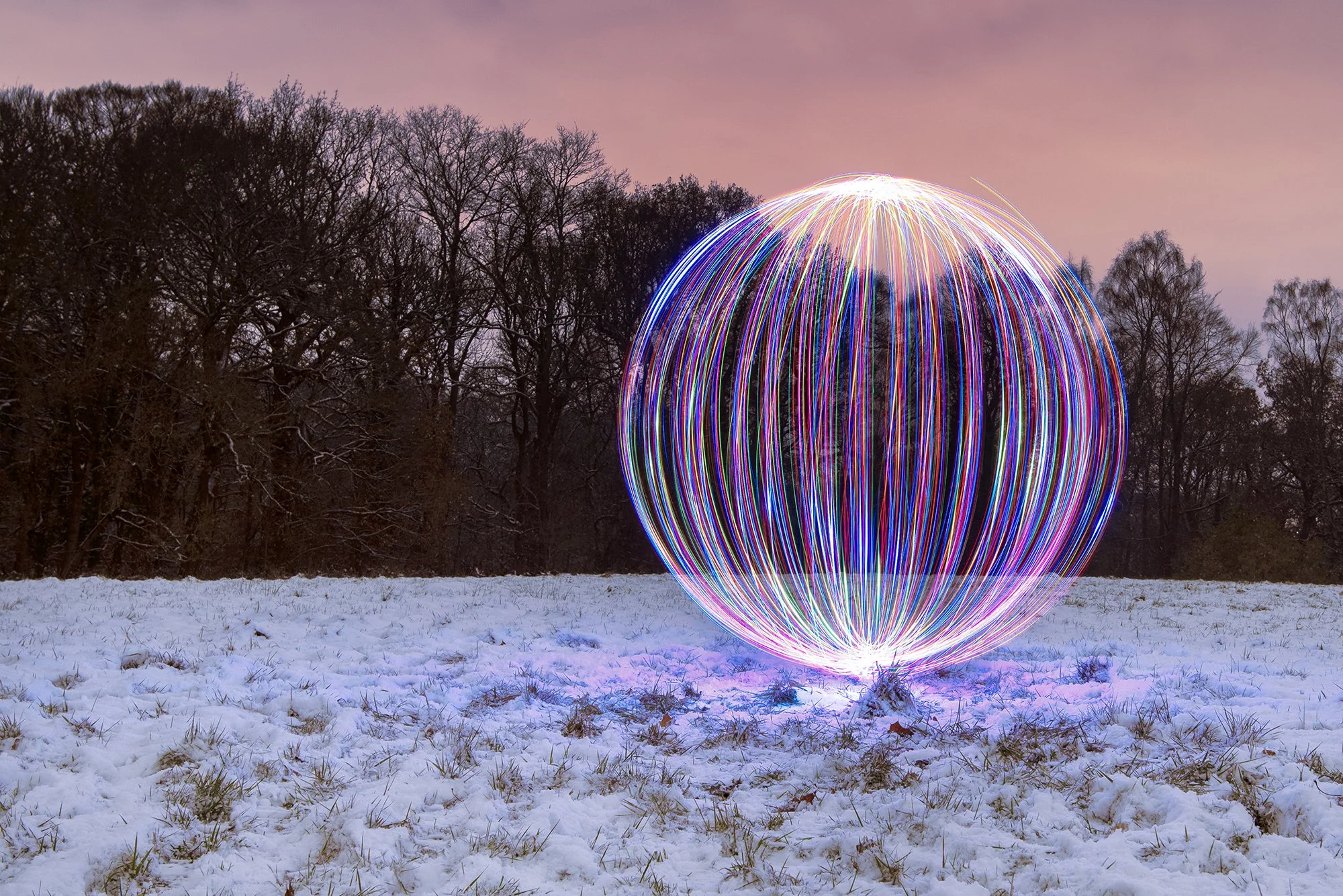 Colorful light trail in a spherical shape glowing in a snowy field during dusk with a tree line in the background.