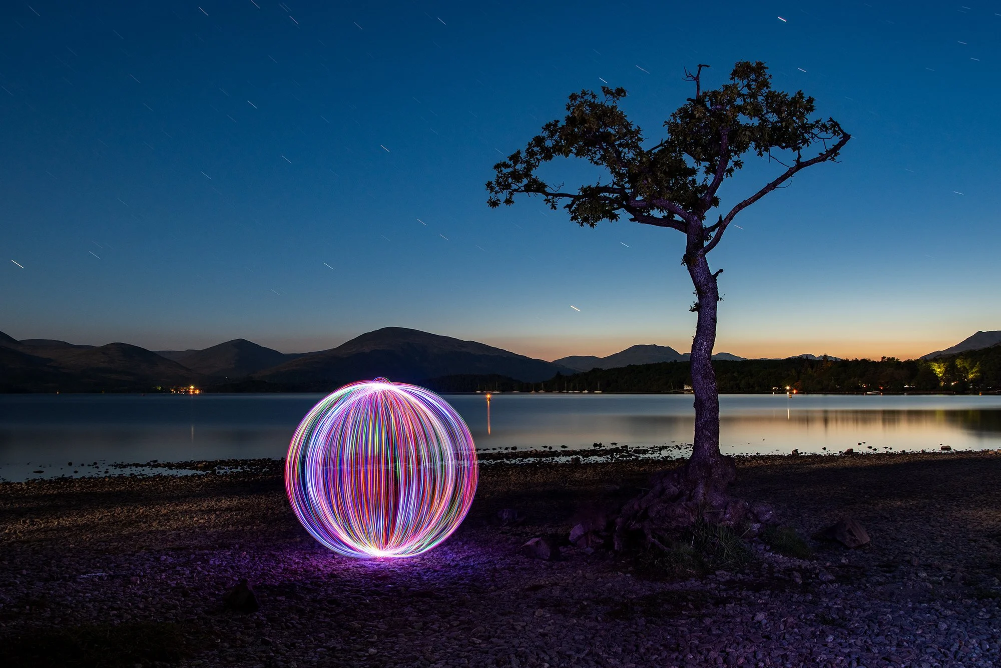 A nighttime landscape featuring a lone tree by a calm lake with a mountain range in the background. There is a glowing light orb or sphere on the ground near the tree, with streaks of light around it, and star trails in the sky.