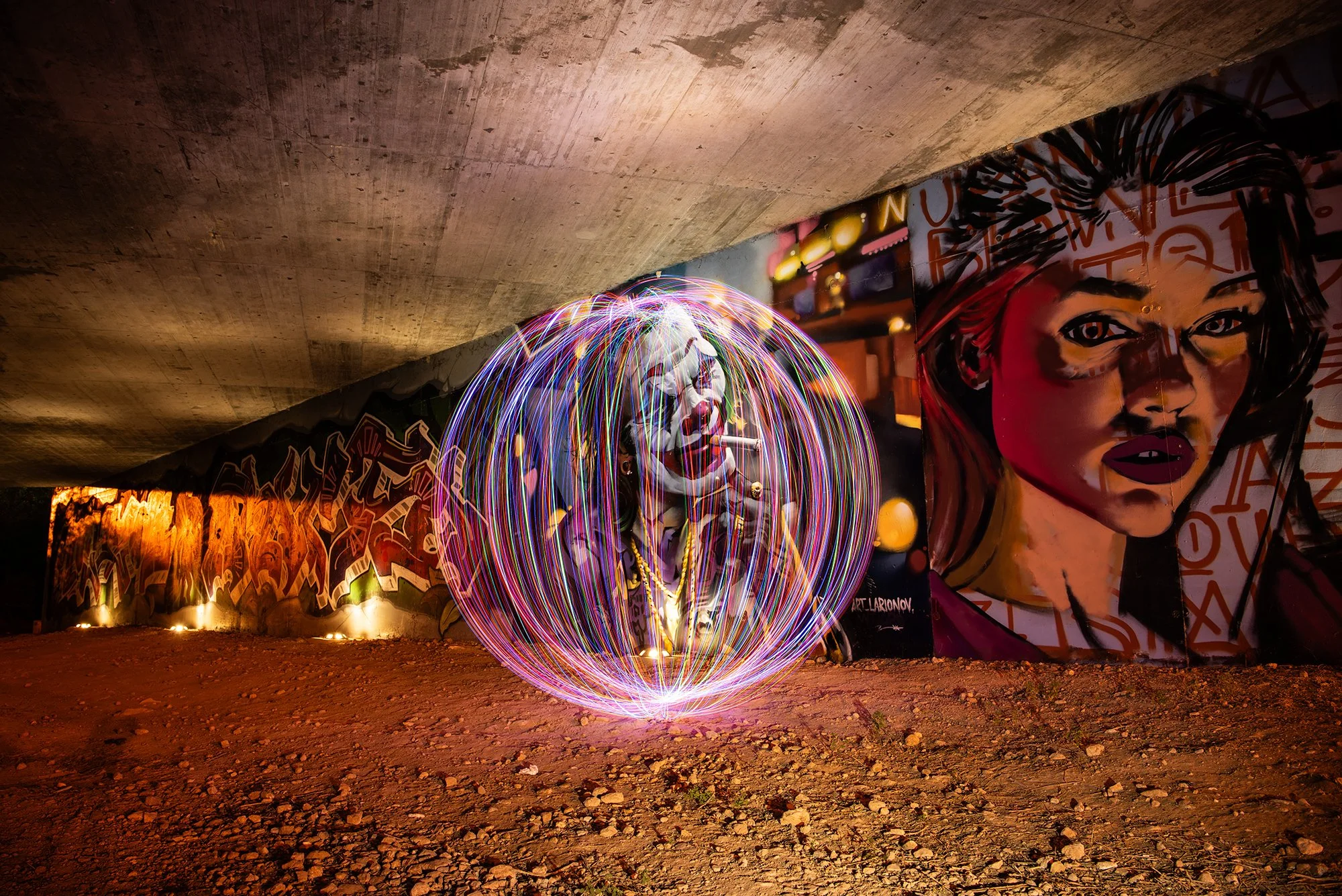 Light trails surrounding a person dressed as a clown with a painted face, smoking a cigarette, under a bridge withgraffiti art, including a large painted portrait of a woman with red hair.