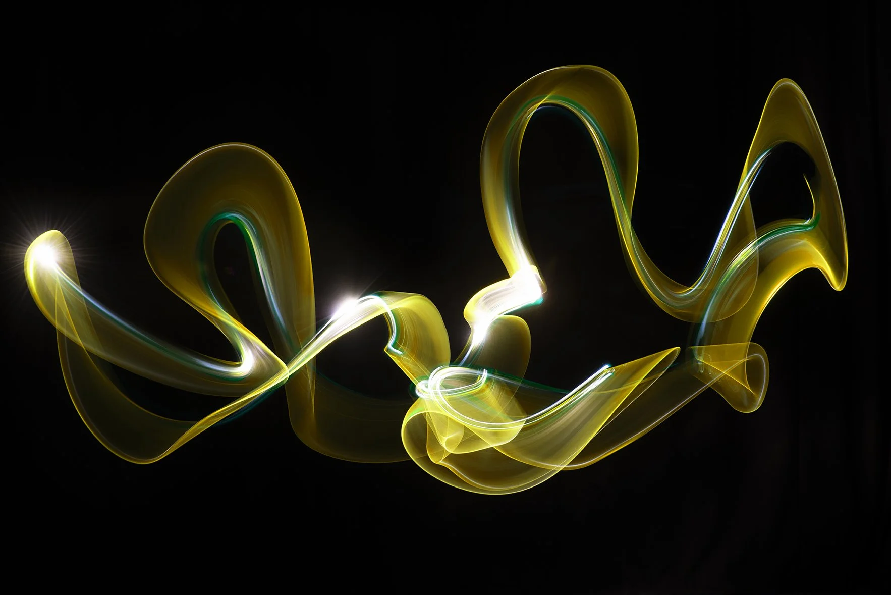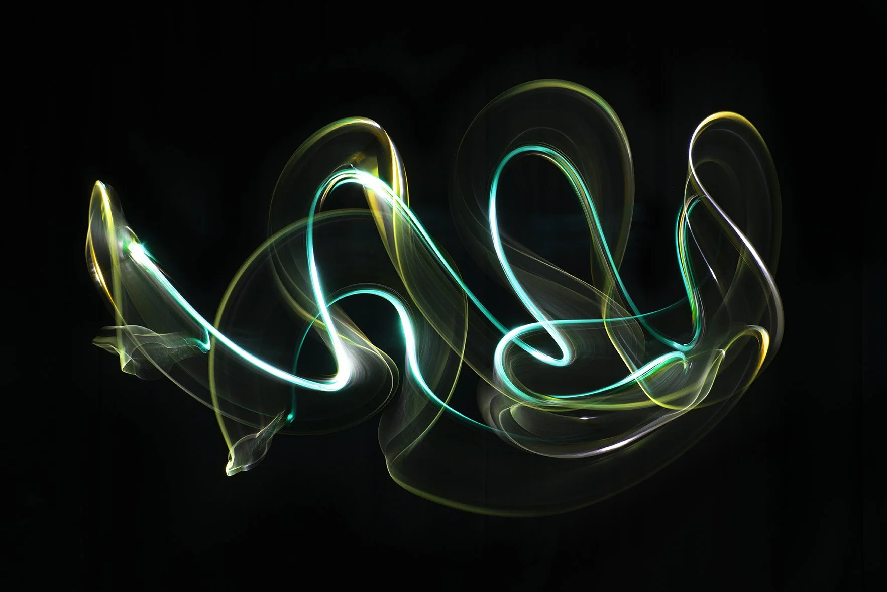 Abstract light trails in yellow, green, and white on a black background.