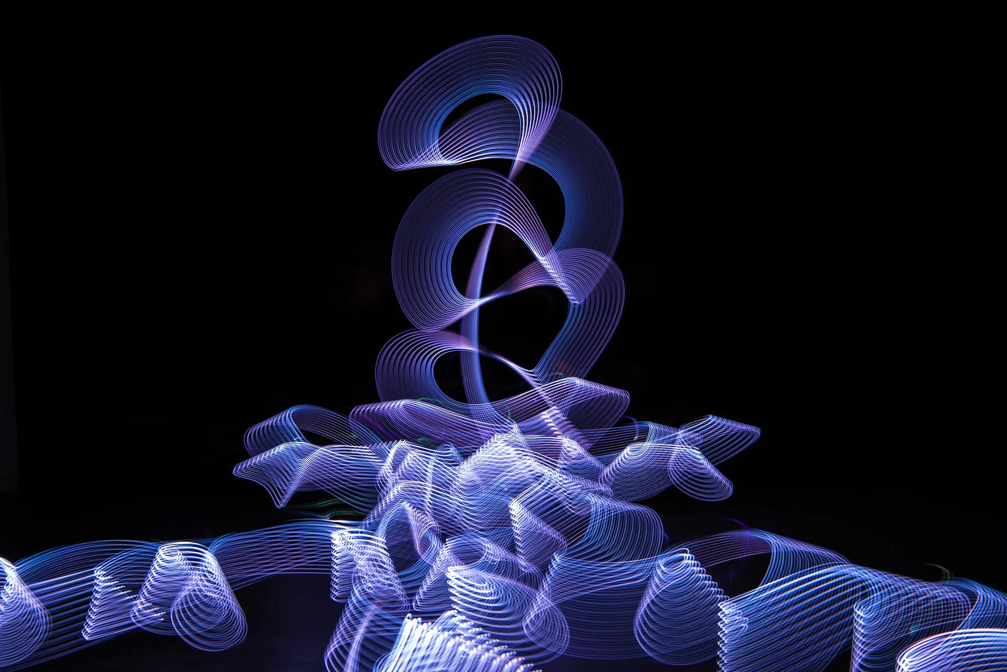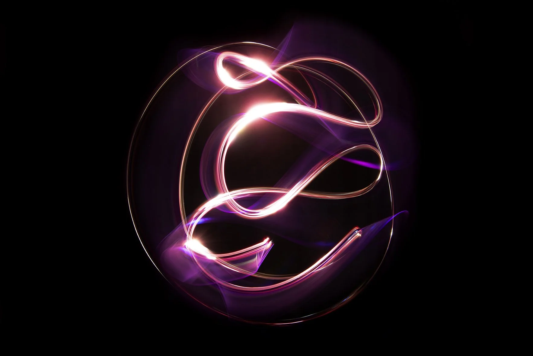 Abstract light trails in purple and blue on black background.